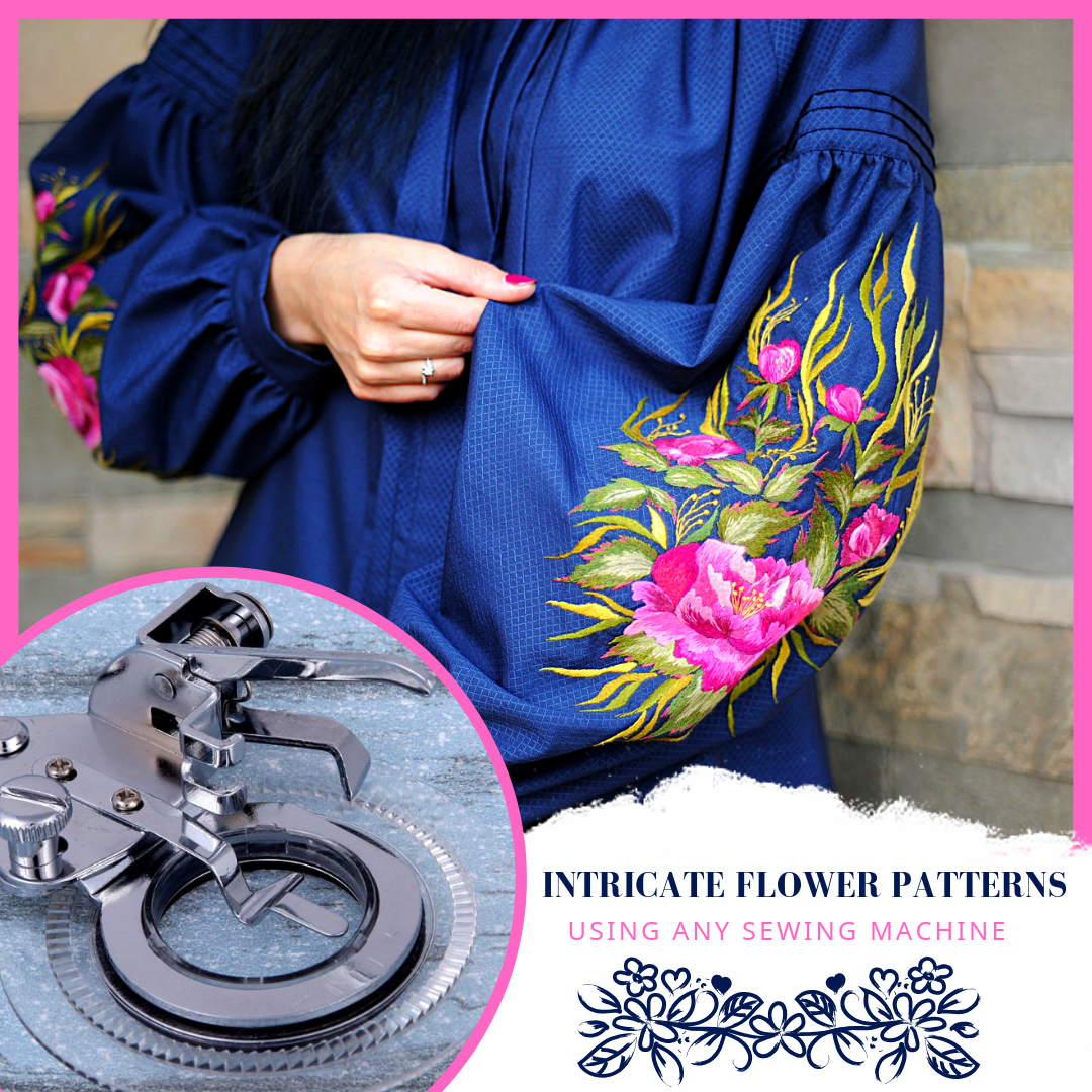 Add embellishments to garments, button covers, craft projects and more. It provides the user with ease by removing the tedious work needed to create floral and circle patterns by hand. This floral stitch foot press can bring your appliqués to life thanks to circular patterns you can create. You can now make embellishments to attach to your garments!
