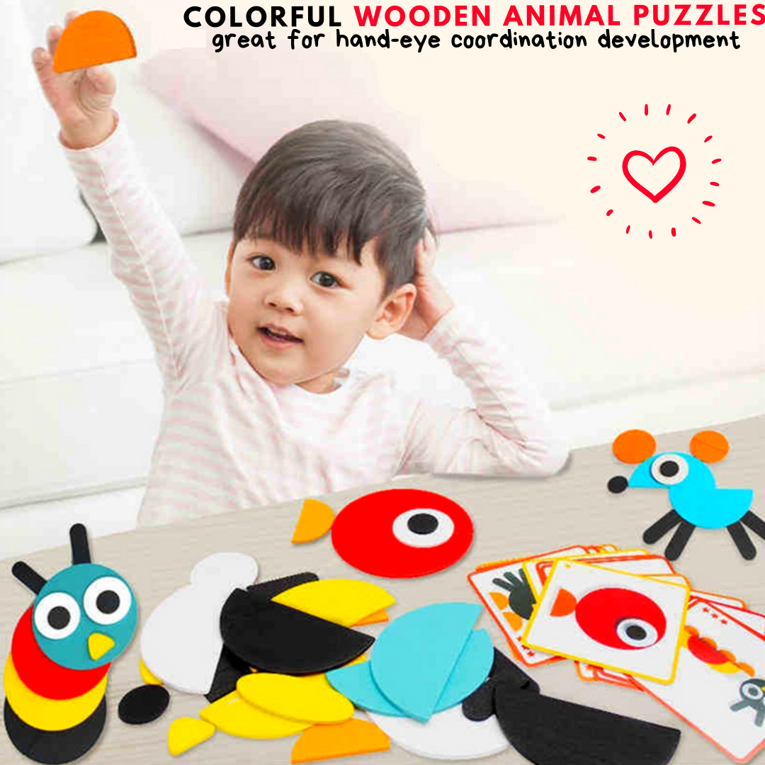 Watch your child's imagination come to life! Our Puzzle & Read - Educational Blocks contains 36 wooden pieces and 60 pattern cards including animals, vehicles, and etc. Kids can try to build what is shown on the cards or create their own designs which are great for developing spatial awareness, color and shape recognition, hand-eye coordination, and problem-solving!