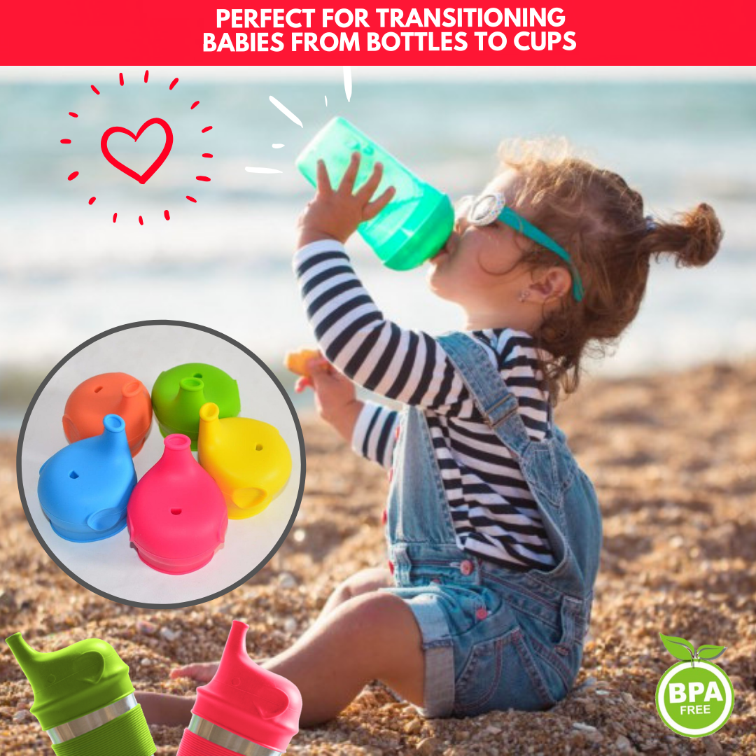 Stop letting your child drink out of toxic plastic bottles and sippy cups. Our lids are made from high quality 100% Phthalate, lead and BPA free food grade silicone. They are safe to use for toddlers and babies 9 months and up. To ensure their safety our lids are 3rd party lab tested in compliance with FDA and CPSIA standards. These lids are also bitten proof and perfect for transiting babies from bottles to cups.