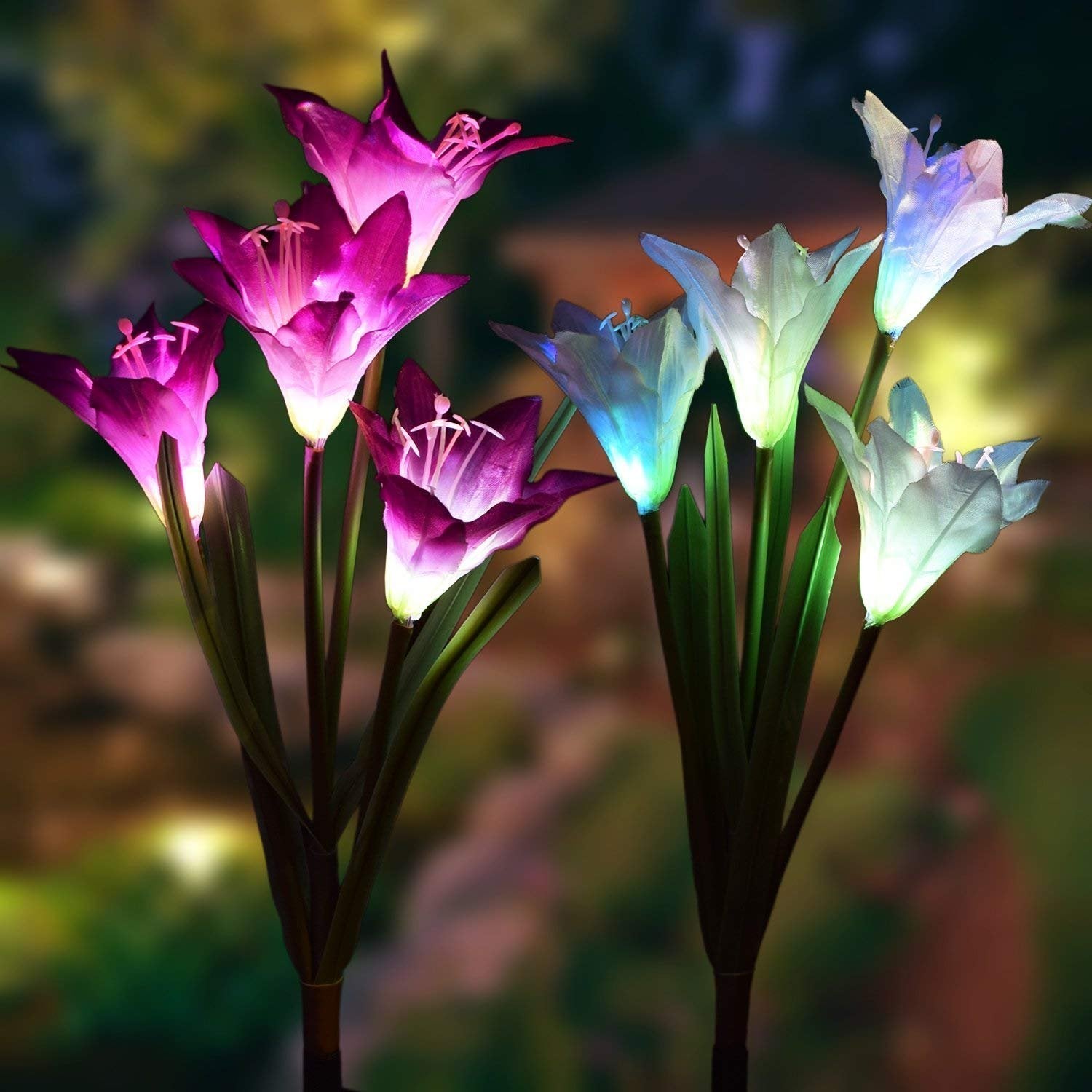 - 7 color changing light & easy to install: No wires & external electricity required, beautiful and graceful lily shaped solar stake lights with 7-color changing that will automatically light up in the dark to illuminate your backyard and pathway.